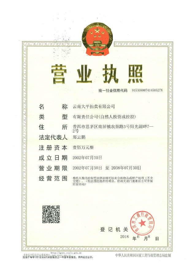 云南大平拍賣有限公司是一家經(jīng)云南省經(jīng)貿(mào)委于2002年6月15日批準(zhǔn),由思茅地區(qū)工商行政管理局于2002年7月30日核準(zhǔn)成立的手續(xù)齊備、資質(zhì)完善的綜合性拍賣企業(yè),是一家拍賣經(jīng)驗(yàn)豐富、市場(chǎng)資源龐大、組織結(jié)構(gòu)優(yōu)秀的具有超前經(jīng)營(yíng)理念的企業(yè)。2004年被省拍協(xié)評(píng)為理事單位。