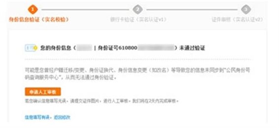 若身份信息未通過(guò)驗(yàn)證,用戶(hù)需點(diǎn)擊【申請(qǐng)人工審核】提交雙證由支付寶進(jìn)行人工審核(審核時(shí)間:2天)。審核通過(guò)后請(qǐng)?jiān)俅蔚卿浿Ц秾氋~戶(hù)繼續(xù)進(jìn)行認(rèn)證,點(diǎn)擊【實(shí)名認(rèn)證】跳轉(zhuǎn)至第4步流程進(jìn)行銀行卡驗(yàn)證。