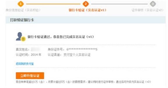 5.通過(guò)支付寶實(shí)名認(rèn)證v1(收付款額一般為1萬(wàn)元)。若還需要更大額收付款,可點(diǎn)擊【立即升級(jí)認(rèn)證】進(jìn)行實(shí)名認(rèn)證v2操作。