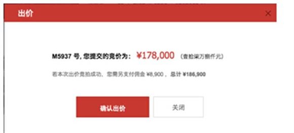2.出價(jià)后,會(huì)出現(xiàn)提示框,并提示您包含傭金的金額,以供參考(其他費(fèi)用請(qǐng)參看《競(jìng)價(jià)須知》)。如確定則點(diǎn)擊【確認(rèn)出價(jià)】,否則請(qǐng)點(diǎn)擊【關(guān)閉】